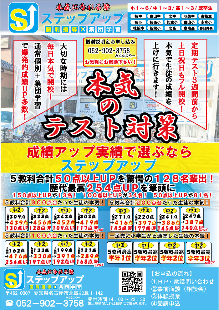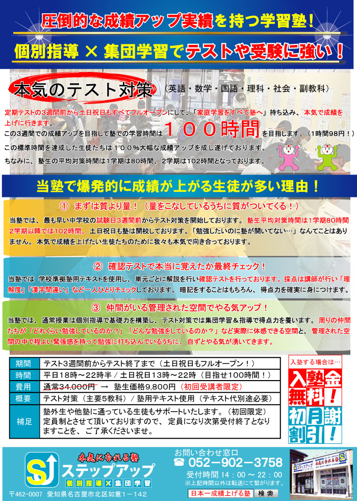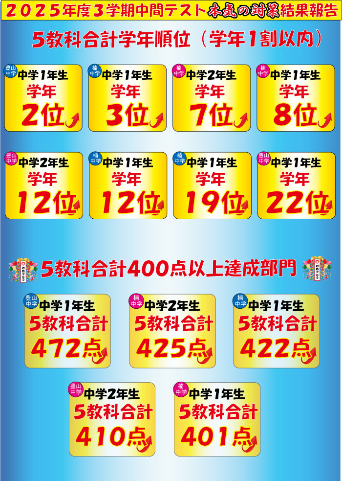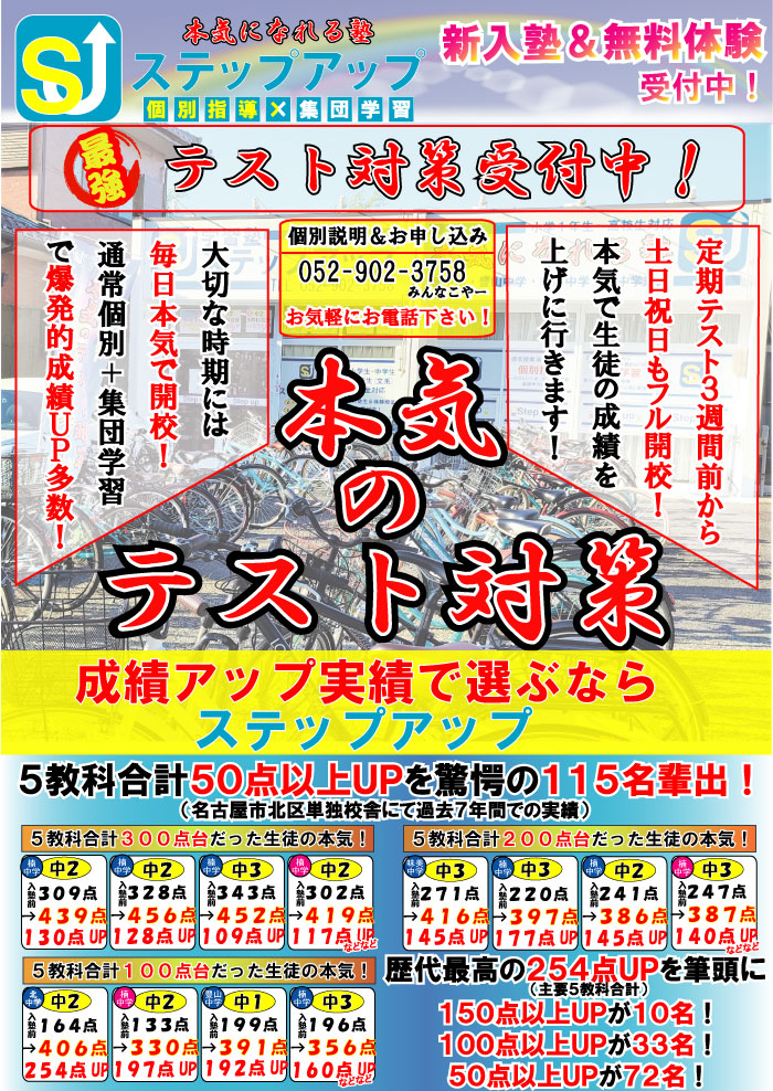 ※中1、中2は3学期の学年末テストが終わりましたら、別途ぶろぐにてご紹介させて頂きます