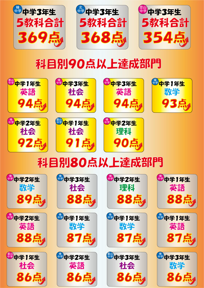 9月の頭から行ってまいりました2学期中間へ向けた「本気のテスト対策」が終わり、塾生の結果が出そろいましたので報告をさせて頂きます![]()