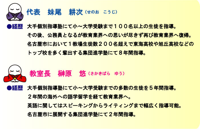 講師はアルバイトではなく、プロ講師2名で、女子生徒も安心な女性講師・教室長の榊原と、多感な時期の男子生徒も力強く導く男性講師・代表の妹尾が大切なお子様を責任もって指導致しております。