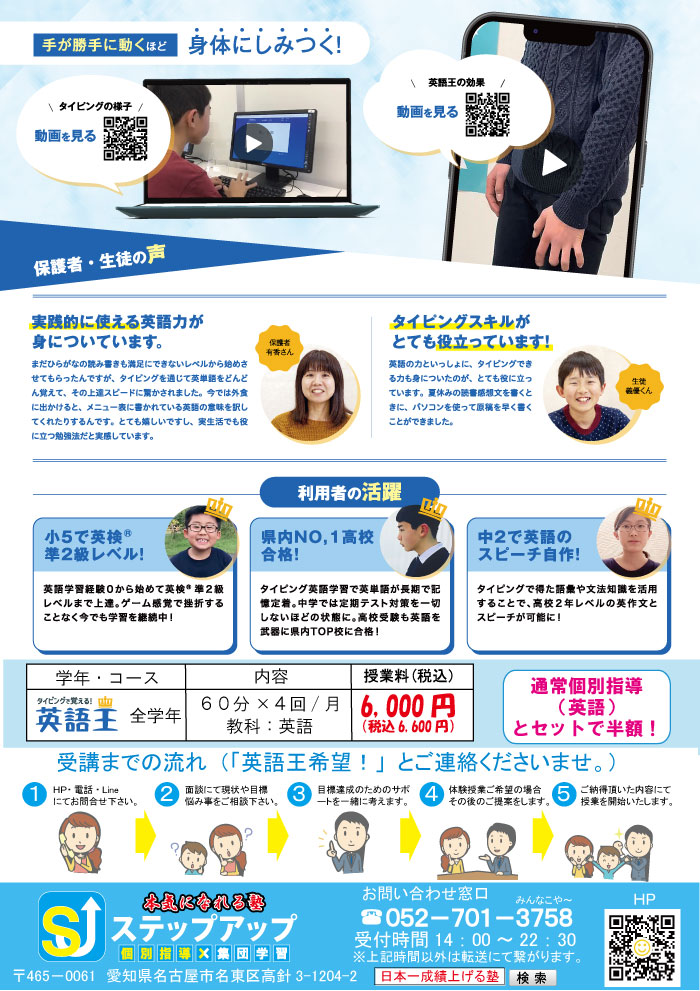 英語王コースでは、タッチタイピング(手元を見ないタイピング) の完全マスターと高校3年生までに学習する英単語の完全習得を目指します。